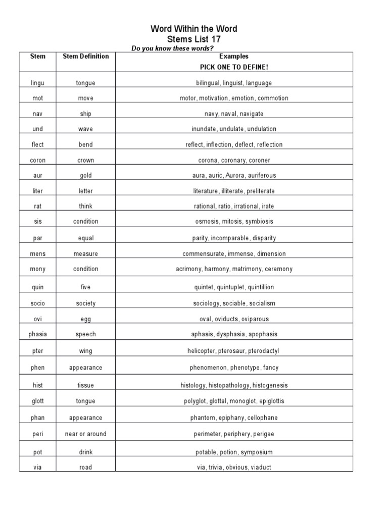 Word Within the Word Stems List 17 Stem Stem Definition Examples Pick